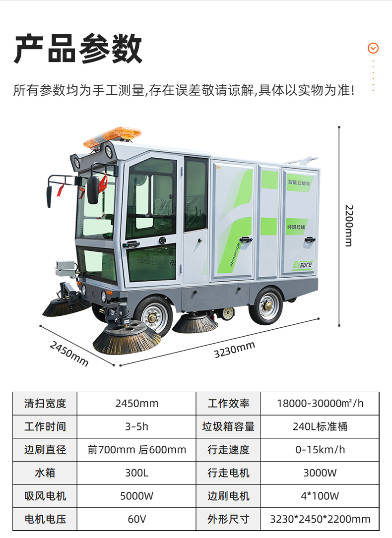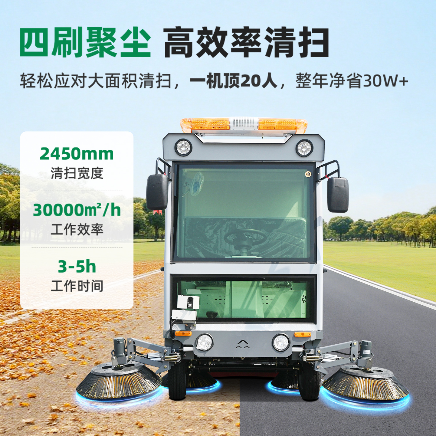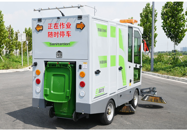 莱特LT-G86型全封闭四轮驾驶式扫地车,此车辆为纯吸款高性能车辆、无滚刷结构,使用效果更稳定。车辆具备智能语音系统,配备高压清洗和高压雾炮功能,清扫宽度2450mm,满电工作时间为3-5小时,工作效率30000㎡/h,采用的是特种车专用磷酸铁锂电池,配置长度4米可拆卸手持吸管,吸净率高,作业速度快。后置240L标准垃圾桶,收集满灰尘垃圾之后,可以直接更换垃圾桶,效率高,无需人工倾倒垃圾。高压雾炮射程可达10米以上,可对作业环境高效的降尘,还可以用于绿植养护和环境消杀。高压水枪可以对地面顽固污渍进行清洁,还可以冲洗路牙石,为绿植浇水,工作之余,还可以用高压水枪清洗车辆。应用场景为:厂区、车间、公园、街道、物业小区、码头、学校、机场等需要大面积清扫的区域区域。
