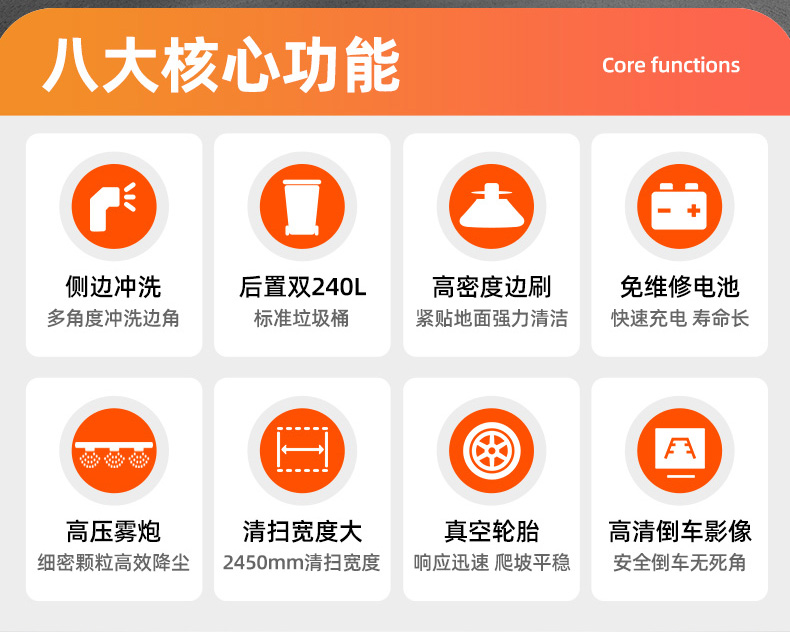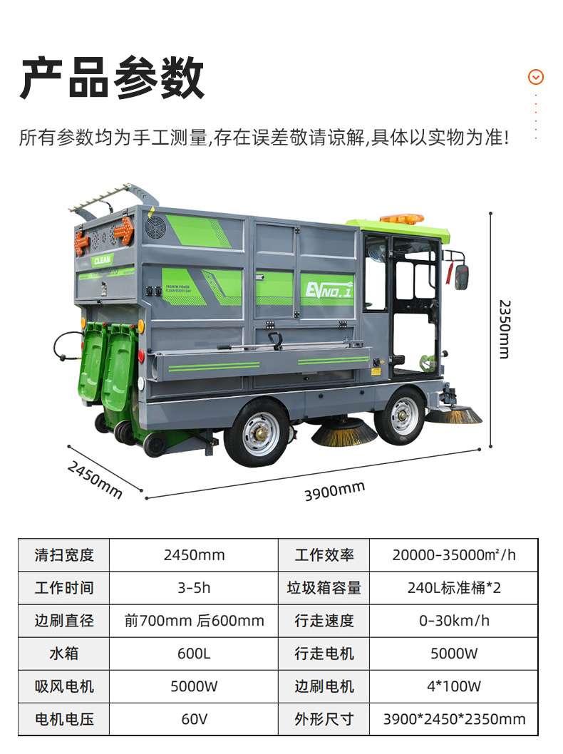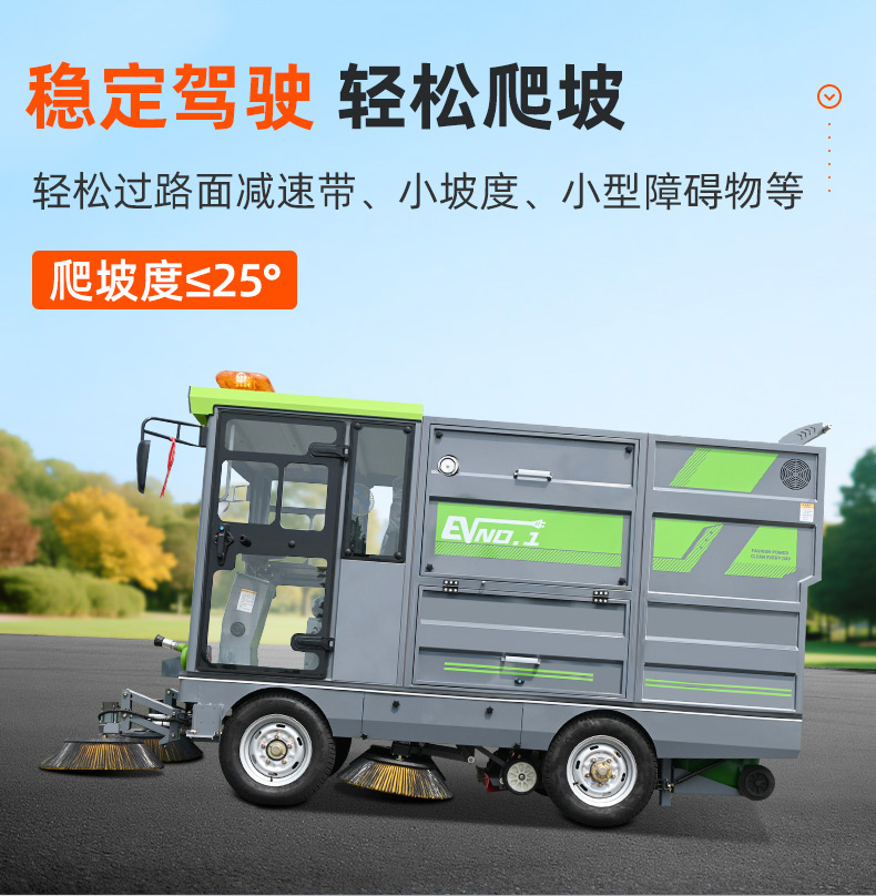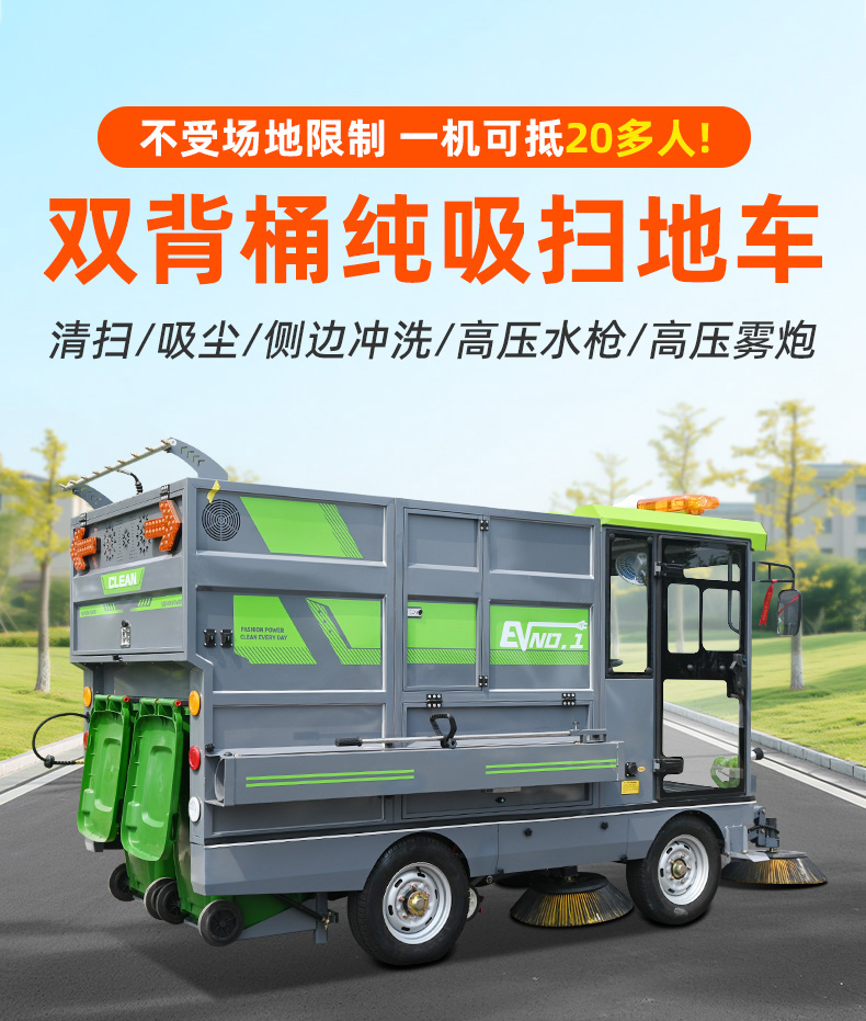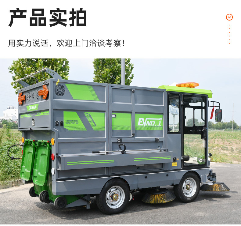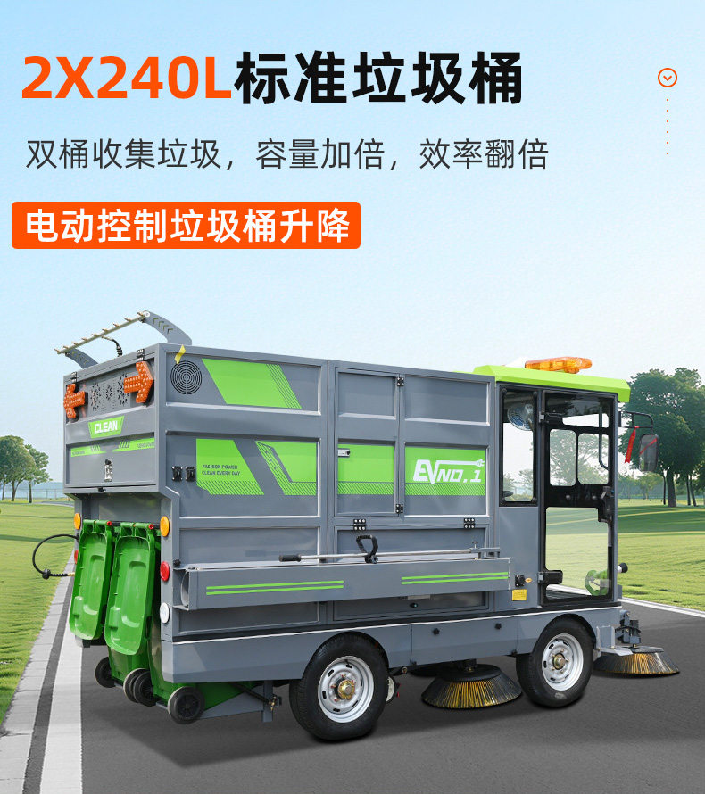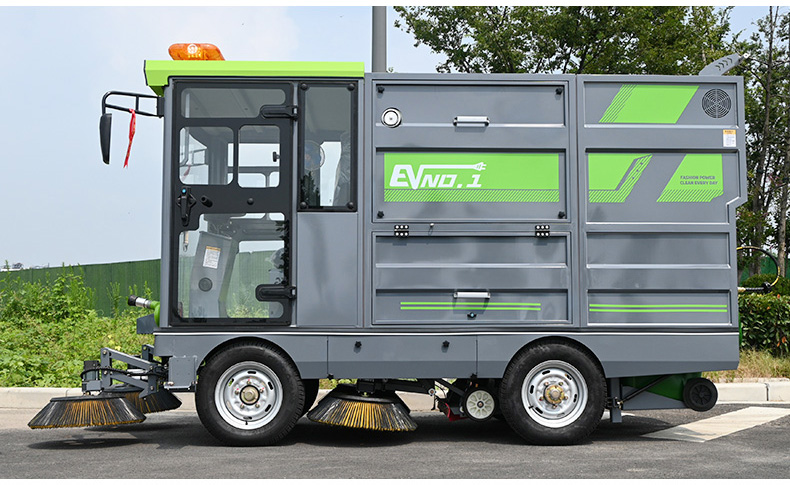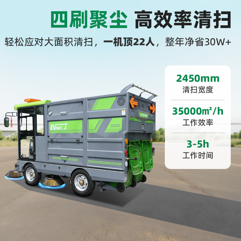 莱特LT-G90型全封闭四轮驾驶式扫地车,此车辆为纯吸款高性能车辆、无滚刷结构,使用效果更稳定。车辆具备智能语音系统,配备高压清洗和高压雾炮功能,清扫宽度2450mm,满电工作时间为3-5小时,工作效率35000㎡/h,采用的是特种车专用磷酸铁锂电池,配置长度4米可拆卸手持吸管,吸净率高,作业速度快。后置双240L标准垃圾桶,收集满灰尘垃圾之后,可以直接更换垃圾桶,效率高,无需人工倾倒垃圾。高压雾炮射程可达10米以上,可对作业环境高效的降尘,还可以用于绿植养护和环境消杀。高压水枪可以对地面顽固污渍进行清洁,还可以冲洗路牙石,为绿植浇水,工作之余,还可以用高压水枪清洗车辆。应用场景为:厂区、车间、公园、街道、物业小区、码头、学校、机场等需要大面积清扫的区域区域。