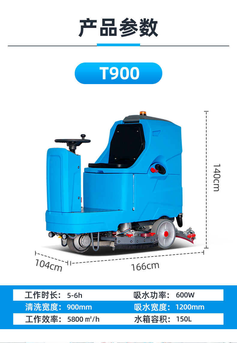 莱特工业洗地机T900型:机身尺寸:1600*1100*1420mm,吸水扒宽度:1200mm,工作效率:6800m²/h,工作宽度:900mm,刷盘转速:190rpm,刷盘功率:600W*2,吸水功率:600W,行走功率:1000W,行走速度:0-7km/h,最大爬坡率:≤25°,额定电压:DC24V,标配电池容量:200Ah锂电池,连续工作时间:5-6h,清水箱容量:175L,污水箱容量:180L,声级:60dB(A),转弯半径:500mm,整车重量:400kg。具备:全自动升高和降低刷盘、吸水扒;刷盘和吸水趴倒车自动升降,有效保护设备损伤;污水箱满了自动停机功能;配有高压清洗枪,可以清洗污水箱和吸水趴,方便快捷;按键式操作面板,简单易懂;双集成控制器,带故障自检功能;滤网可防止污水进入真空电机;配有水量显示器,可直观观察水位变化;大功率前驱电机,转弯灵活,操作便利;超静音设计,适用于对声音敏感的环境,如办公场所,疗养院,医院;吸水扒易装卸,遇到障碍物时自动脱落,可保护吸水扒,帮助机器顺利通过;两个注水口设计:大注水口可实现快速注水,小注水口配备3米长加水管适用于距离水源较远的场所;吸水扒易装卸,遇到障碍物时自动脱落,可保护吸水扒,帮助机器顺利通过。